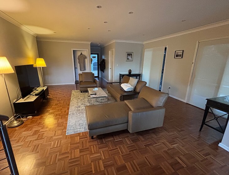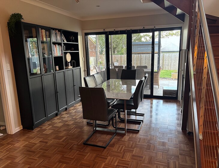 We live in a large, double storey home with kitchen, main bedroom, en-suite and main living areas located on the upper level. There is also a second living and dining area, three bedrooms, bathroom and laundry downstairs.