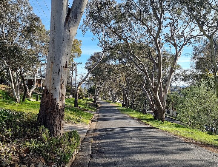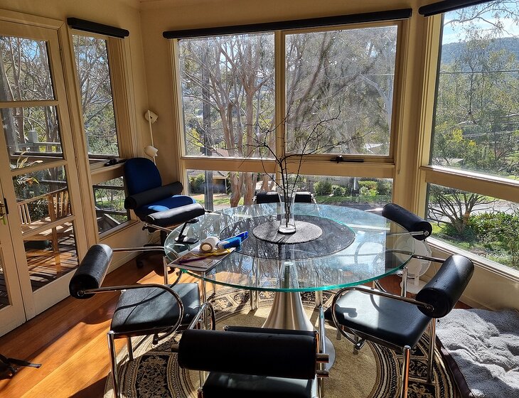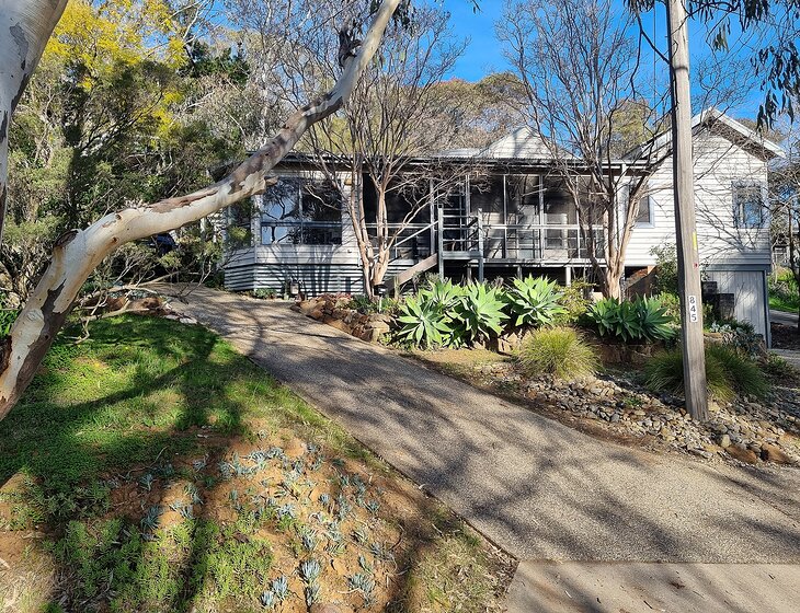 An architect designed quirky timber home on the reverse side of Monument Hill, about 2 km from the centre of Albury (but up a steep hill if you are walking). A lovely native tree-lined street on a slope with a south west view, sometimes providing a lovely sunset. Surrounded by trees with Nail Can reserve 200m away.