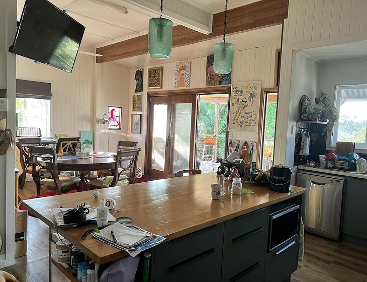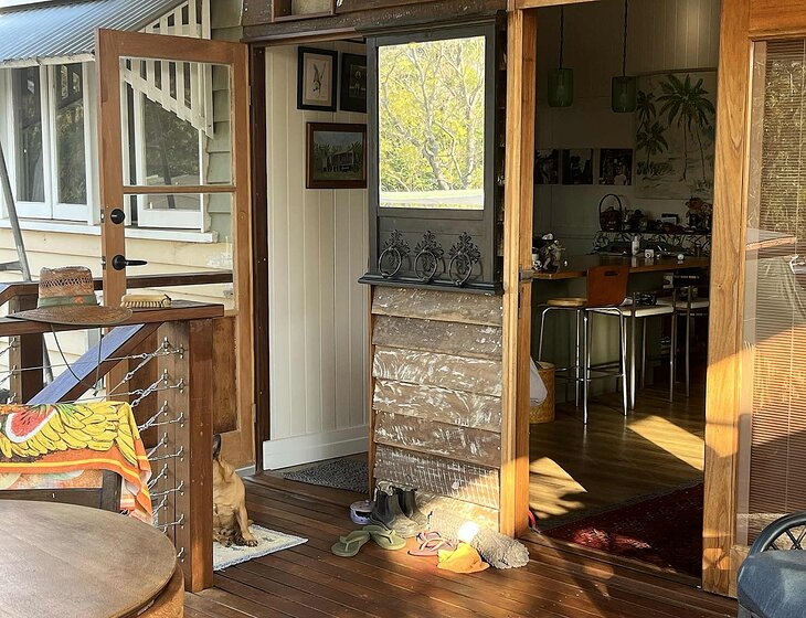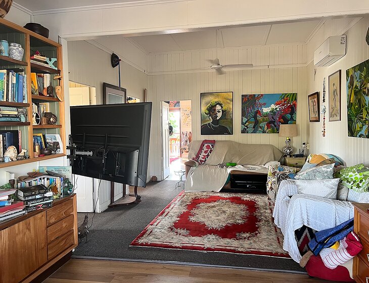 Comfortable air-conditioned updated Queenslander on a town block. Has front and back decks fenced 2 minutes to IGA, newsagent, postoffice, cafes, regional gallery, bakery and more. 10 minutes drive to larger town. Friendly town. Railtrail.across the road.