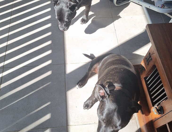 2 x gentle Staffy dogs, very easy going.