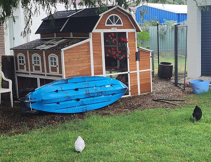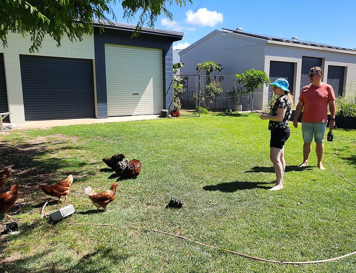 We have a chicken coop and run with 10 chooks. We also let the chickens free range the back yard most days and you'll have 4-6 eggs daily. They have autowater points and a large auto feeder that gets topped weekly.