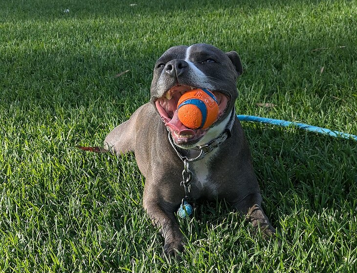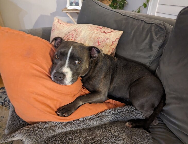 Hello, we have a very snuggly staffy who doesn't like to sleep alone. She is very friendly with all people but she can be choosey with dogs and therefore must be walked on lead only.