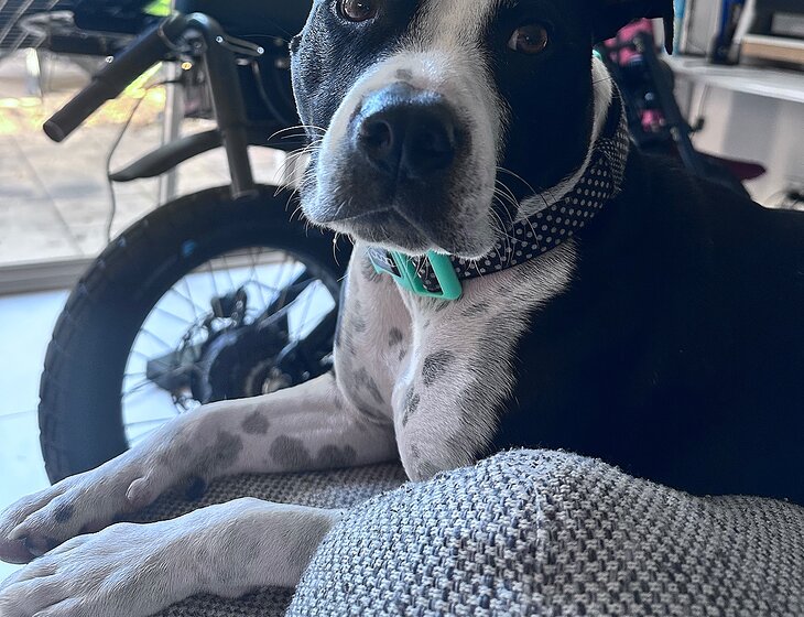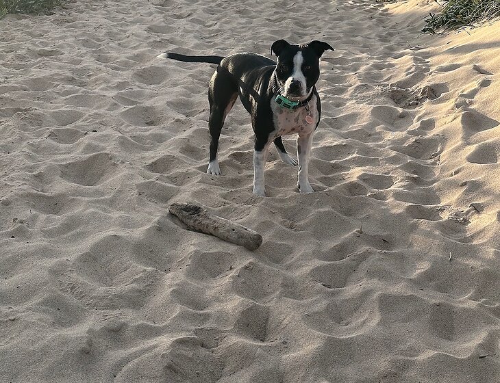 She loves a good ball chase and visit to the nearby dog beach, is good with other animals and will cuddle up with you on the sofa all day.