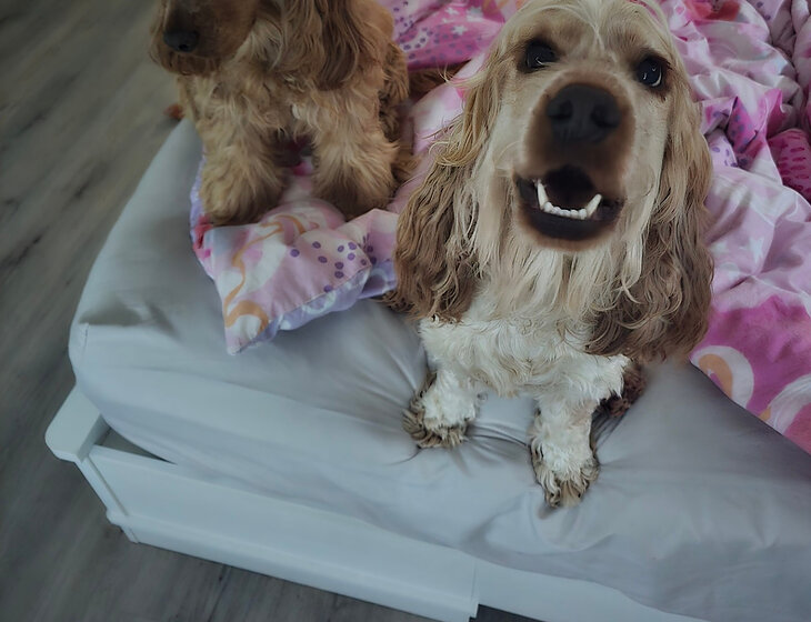 They usually sleep in my bed at night but while you are staying they could sleep in their inside cage area (which they are happy to be in for rest times). They are mostly inside pups- they just want to be around you and play with their toys inside, but they also love to go outside and sniff & play with the ball while we are home.