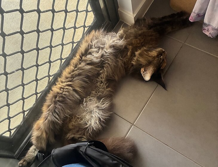 • Queenie, our fluffy Maine Coon cat who thinks she’s part human and loves snuggling.