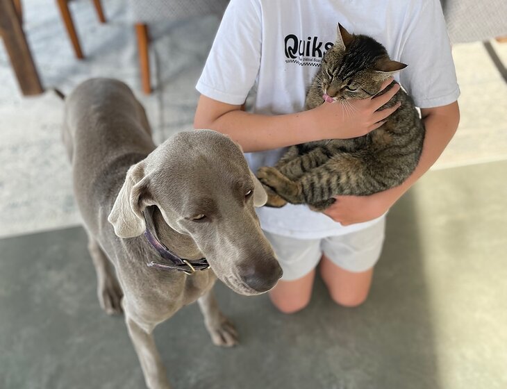 We have the charming Jinx - a Weimaraner and Jax - an affectionate when he feels like it cat.