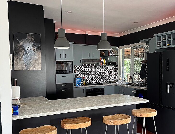 Our home is a renovated 1960s house with 3 bedrooms and 1 bathroom, a garden, and a swimming pool. There is also a large basement area with an office and TV room.