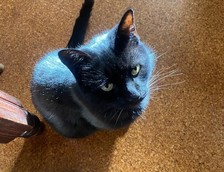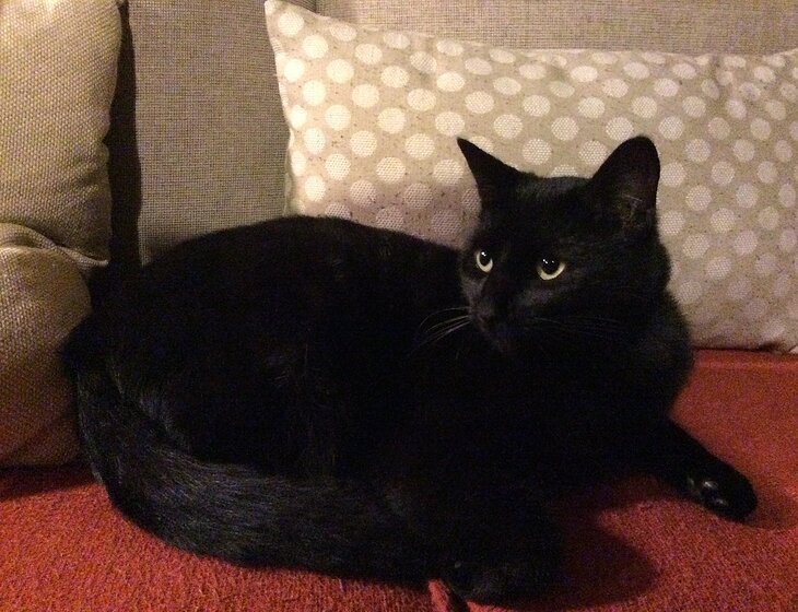 Sooty, our 13 year old female black cat is house-trained and likes company. She is not a fussy eater.
