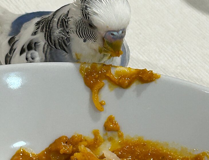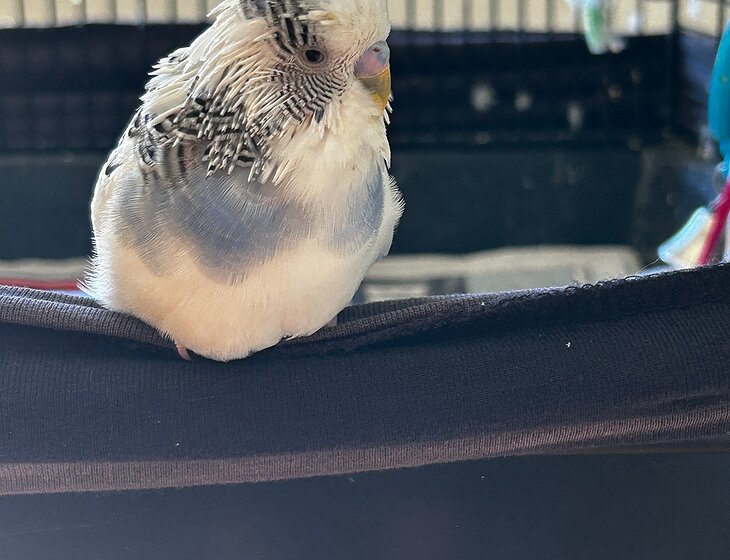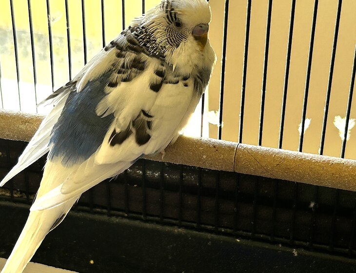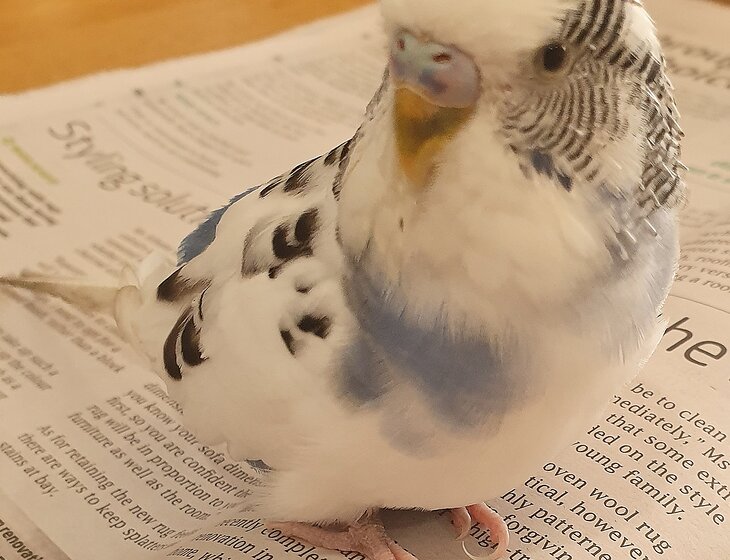 Free-range budgie - small bird with VERY BIG personality. Has access to whole of house but mainly uses kitchen/dining/lounge area and one bathroom. Also spends a bit of time on the floor, so care needed when walking around. Will land on head or shoulders. Likes to share food sometimes. Puts himself into his cage around 7.30pm-8.00pm to go to sleep for the night and lets you know when he wants to have his cage covered for the night and uncovered in the morning. Cage clean weekly. Seed changing every 3 days.