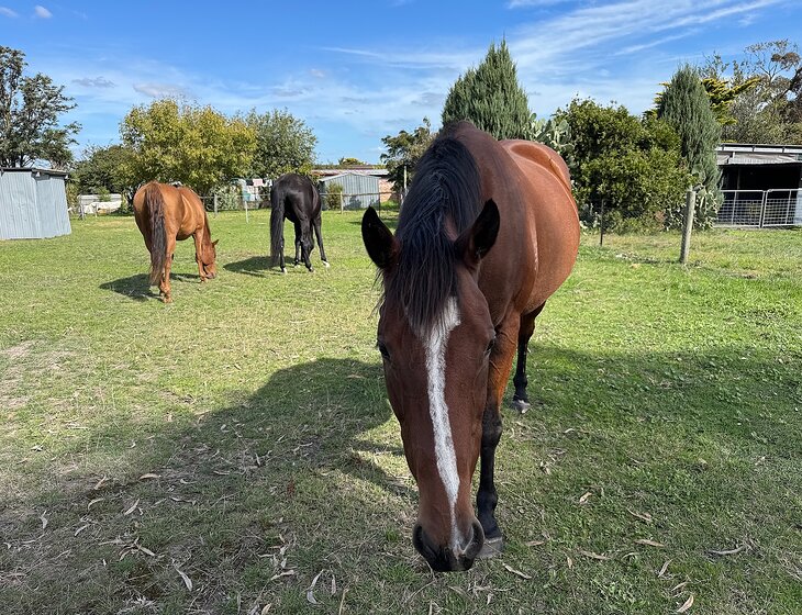 The horses are rescue horses who experienced severe neglect and we have had them for 1-3 years. They are generally curious, friendly and well-mannered but none of them are for riding. They are all geldings, including 16.3 and 15.3 hand thoroughbreds (age 18 and 15 years), and 14 -year-old 14.3 hand Arab/QH cross. They share the paddock together.